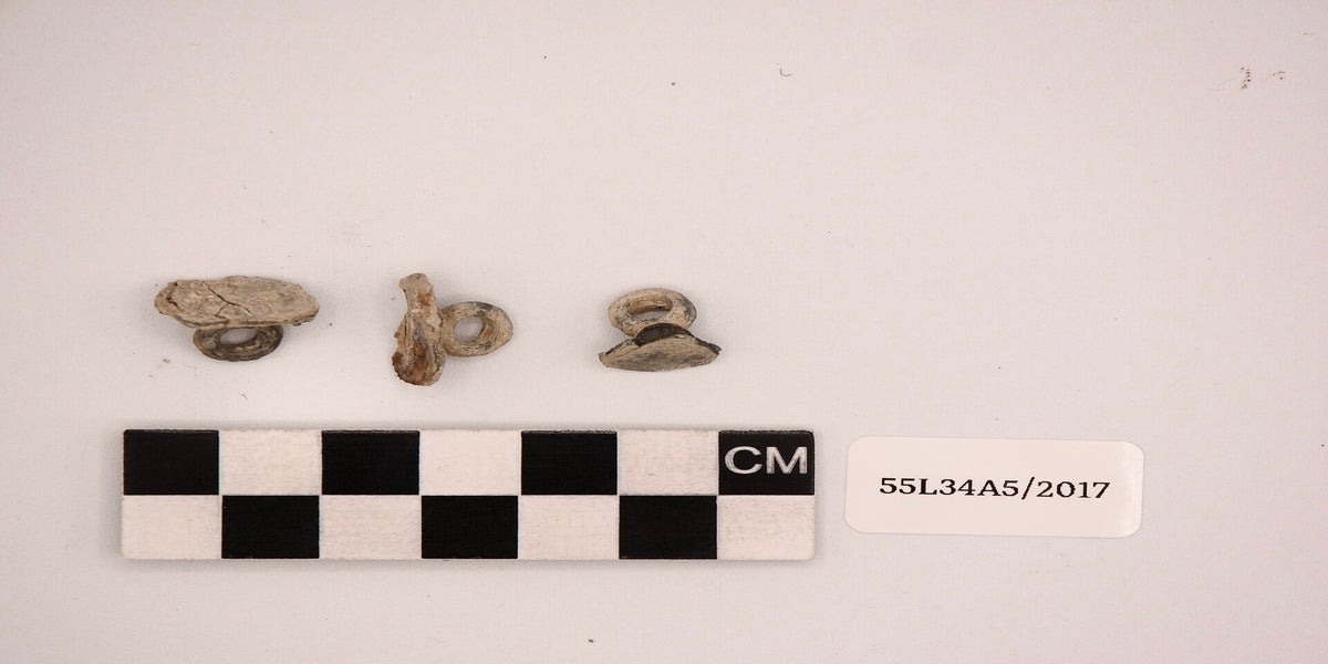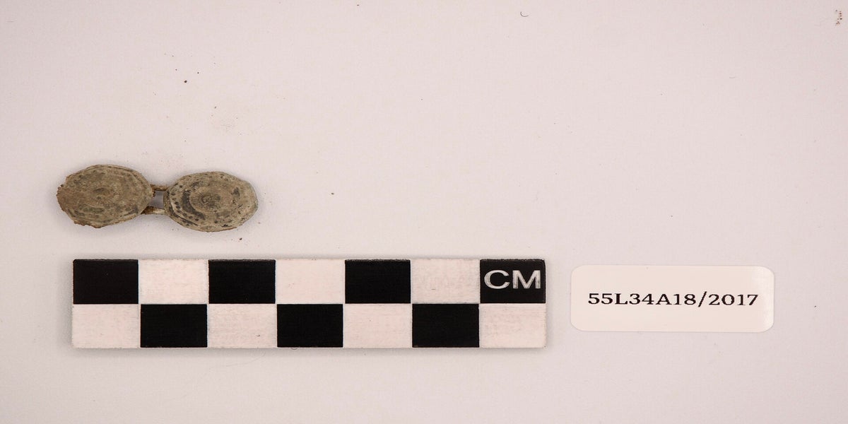 Fragmented Copper-alloy object, center square fastener with 2 circular fastens on either side