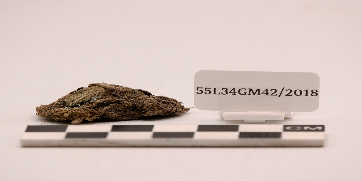 Fragmented Copper-alloy object, attached to fabric, possible clasp / handle